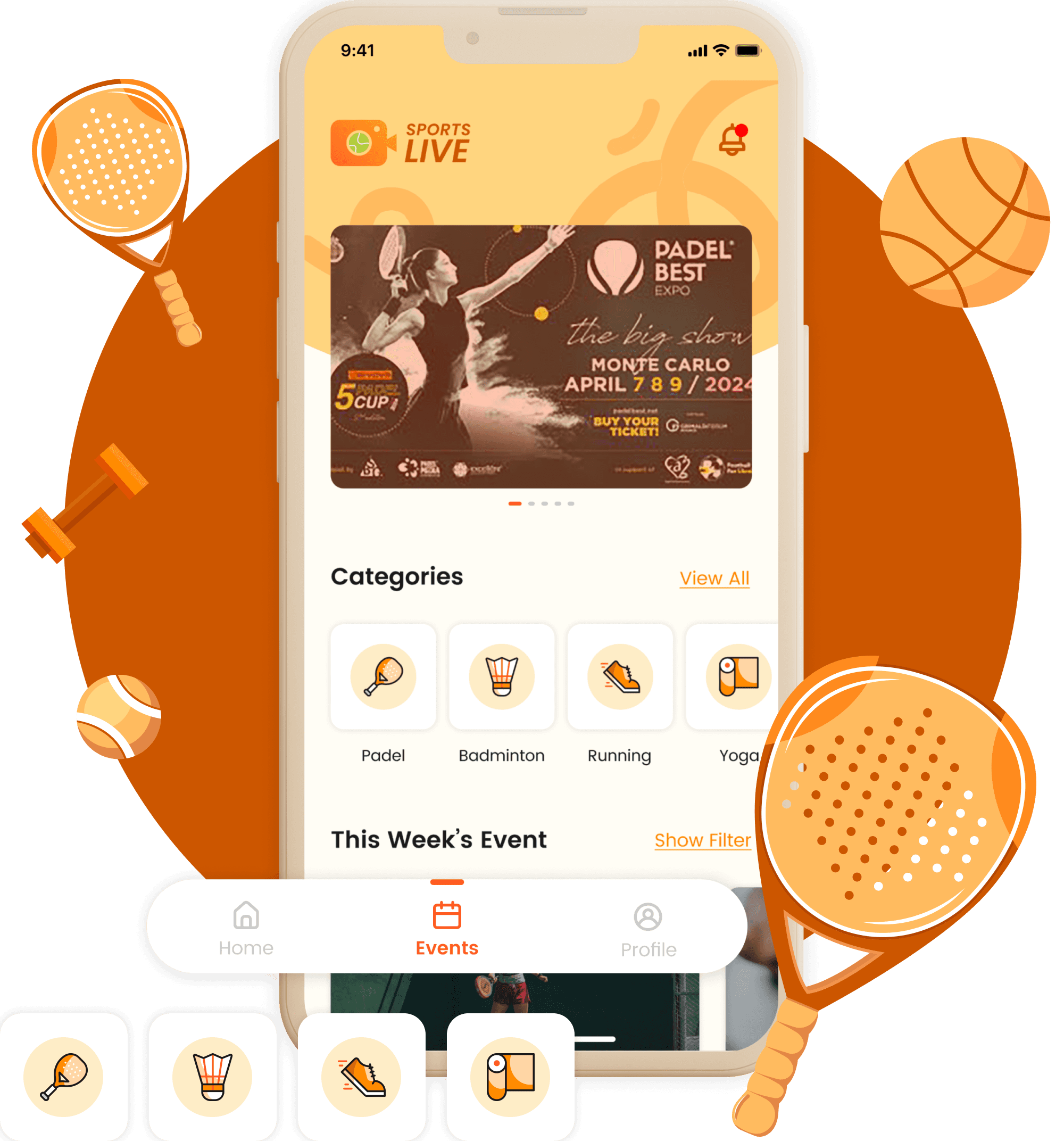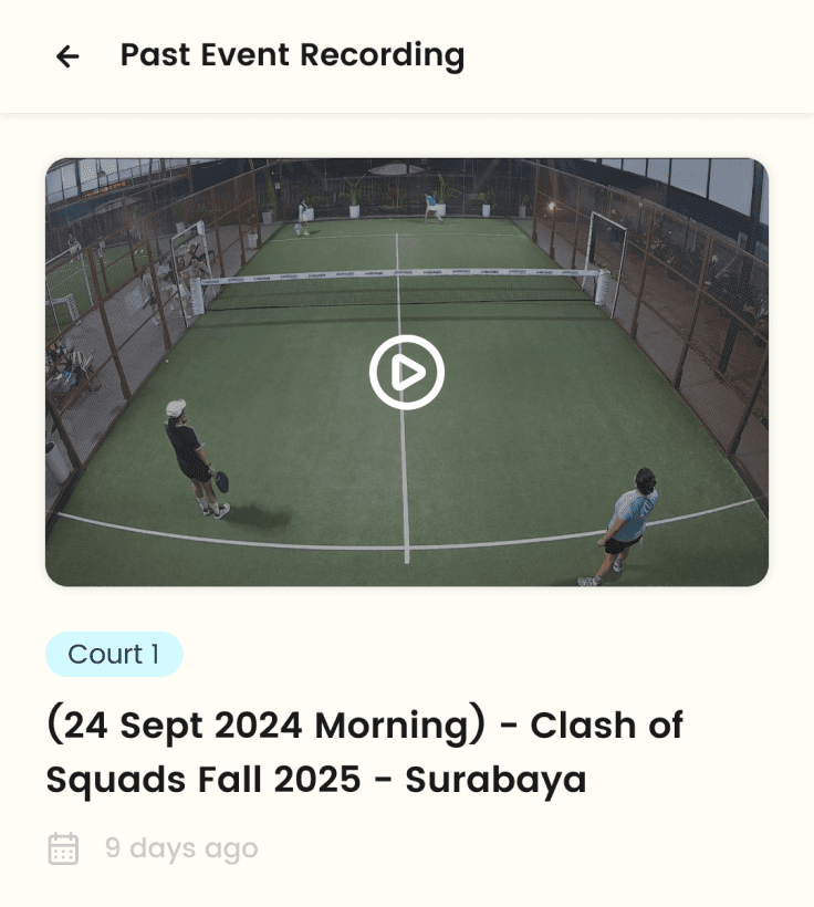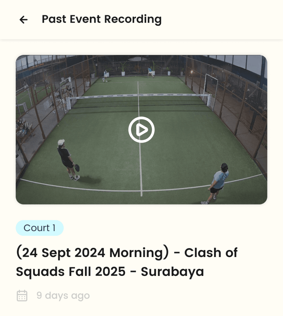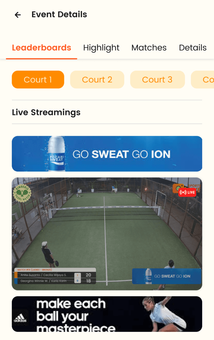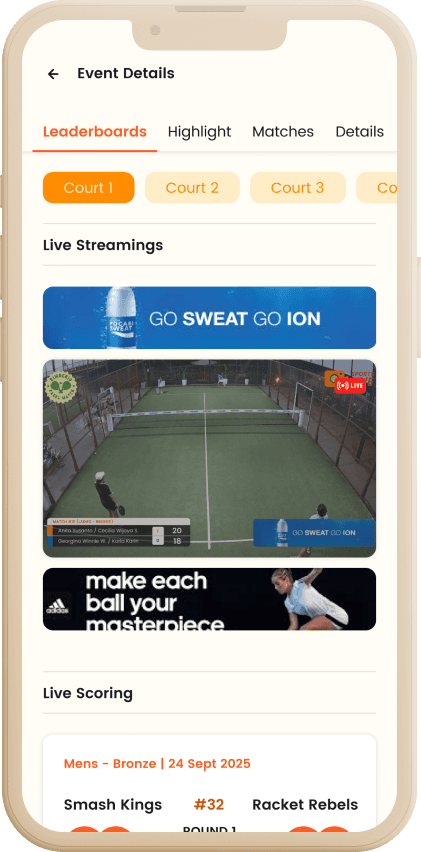 Supports racket sports and community games like badminton, padel, and futsal.